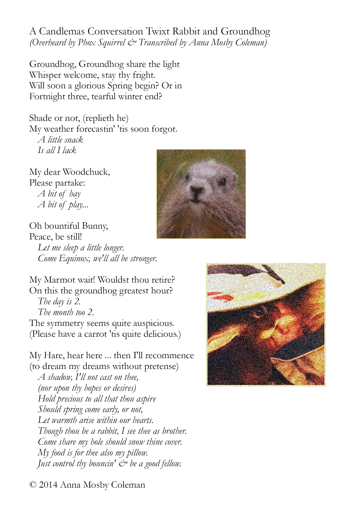 Groundhog: Hey, it’s always lunchtime. And yes, I know it’s the same thing whether I say I see my shadow or not. But I get my 15 minutes of fame, and sometimes a party. Nice way to cheer up on a cold day. Don’t be blue, it’s Feb two. That’s my motto.